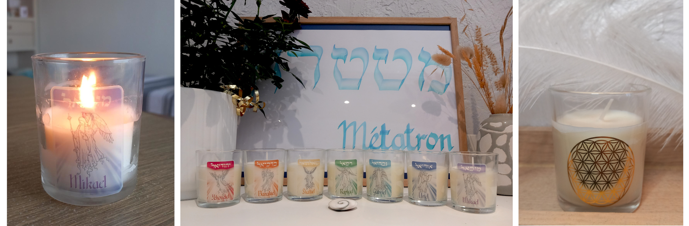 Sont également disponibles les cierges des archanges : in-formés avec la vibration de chaque archange, il sera pour vous un support lumineux qui appuiera vos prières. Les cierges sont réutilisables à l’infini (ou presque): les contenants en verre peuvent être nettoyés et re-remplis avec une nouvelle mèche et de la cire.